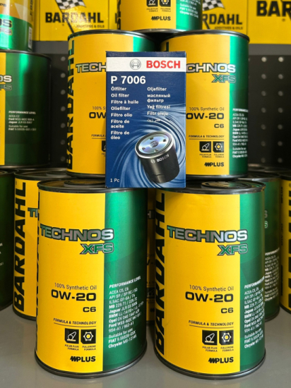 Kit manutenzione completo che include olio motore 100% sintetico 0W-20 Bardahl Technos XFS C6 e filtro olio Bosch P7006. Ideale per motori di ultima generazione Jeep, Alfa Romeo, BMW, Mercedes e altri veicoli compatibili. Comprende olio e filtro necessari per il cambio olio, garantendo massima protezione del motore e riduzione degli attriti interni.